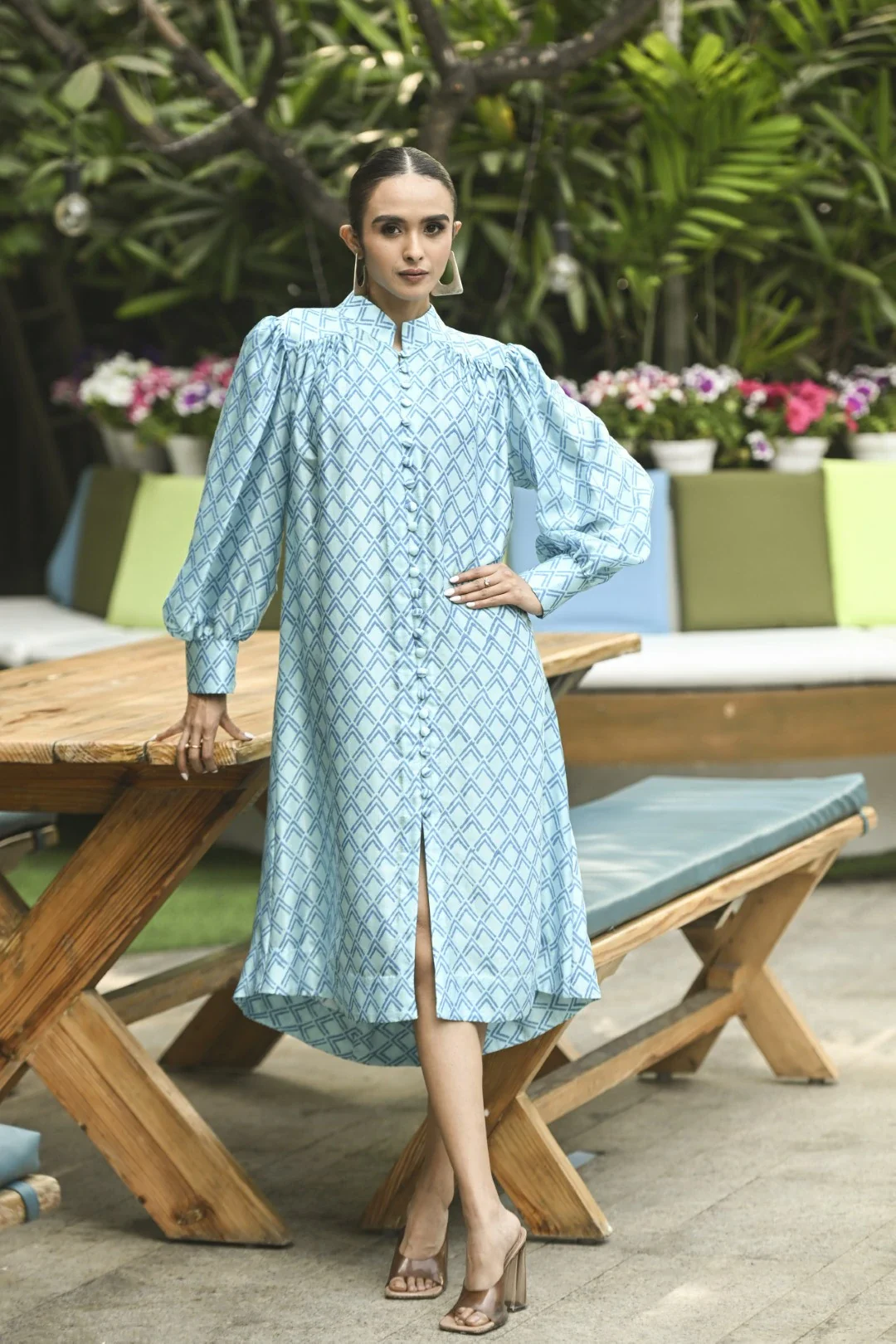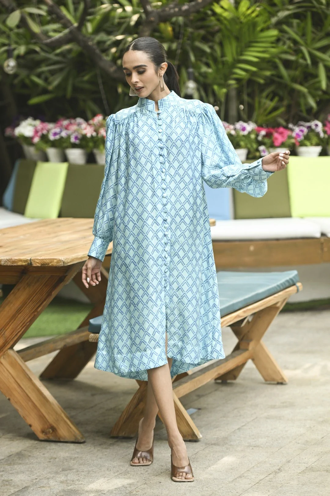 Printed Mid Length Shirt Dress With Bishop Sleeves