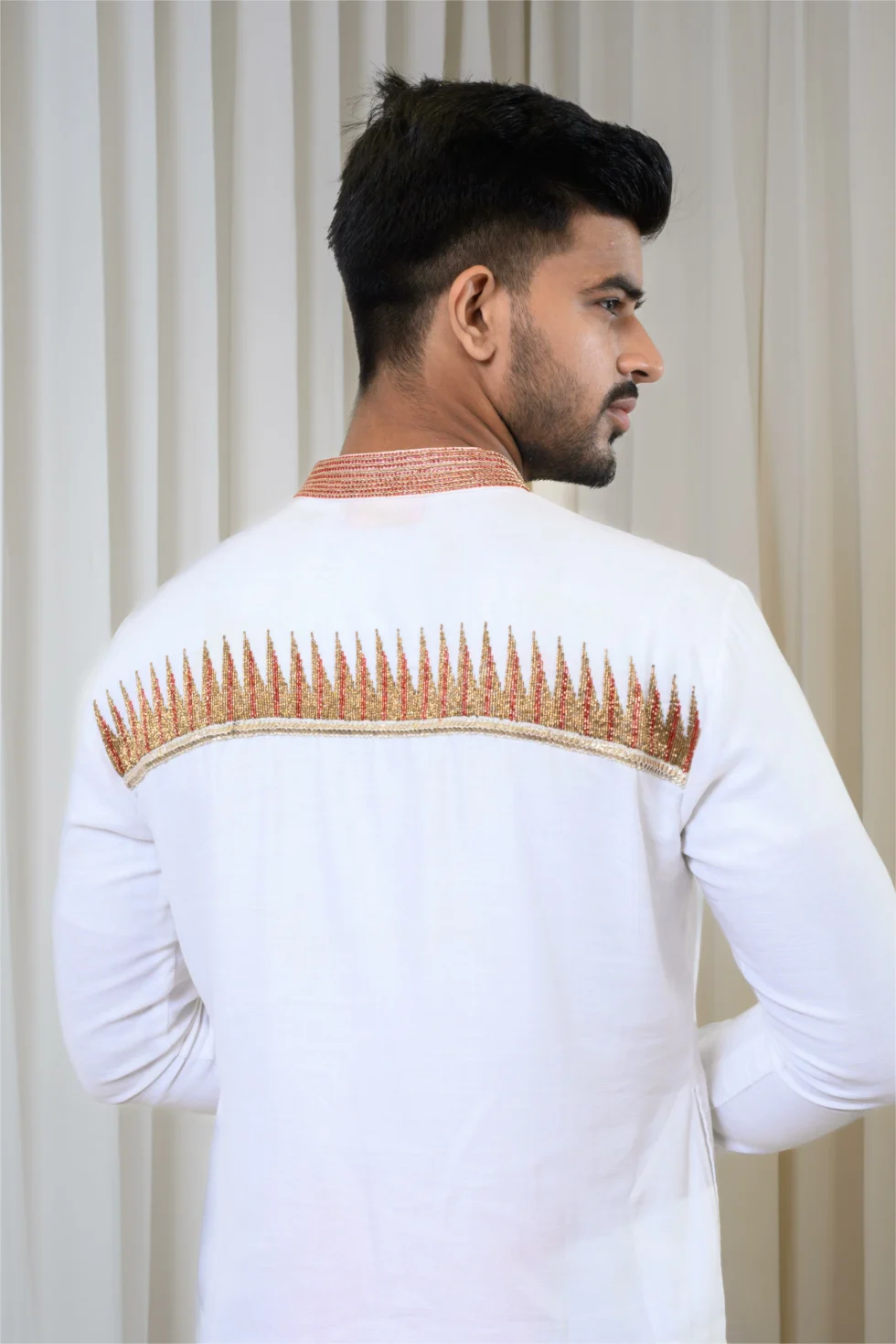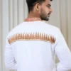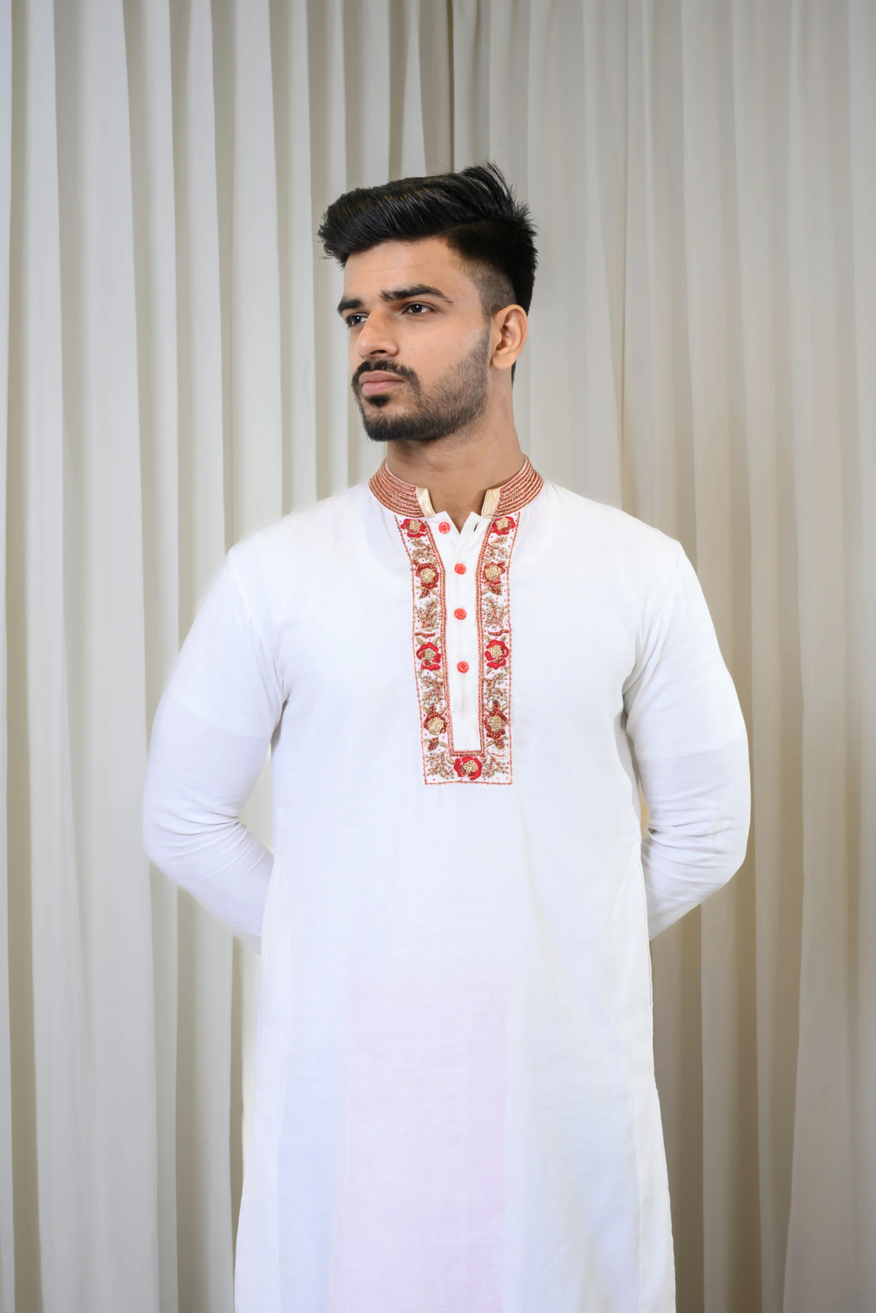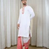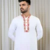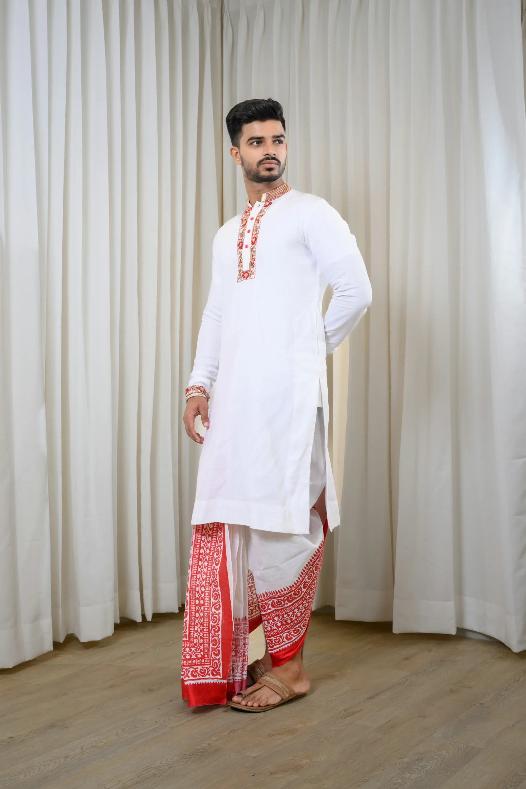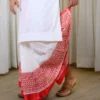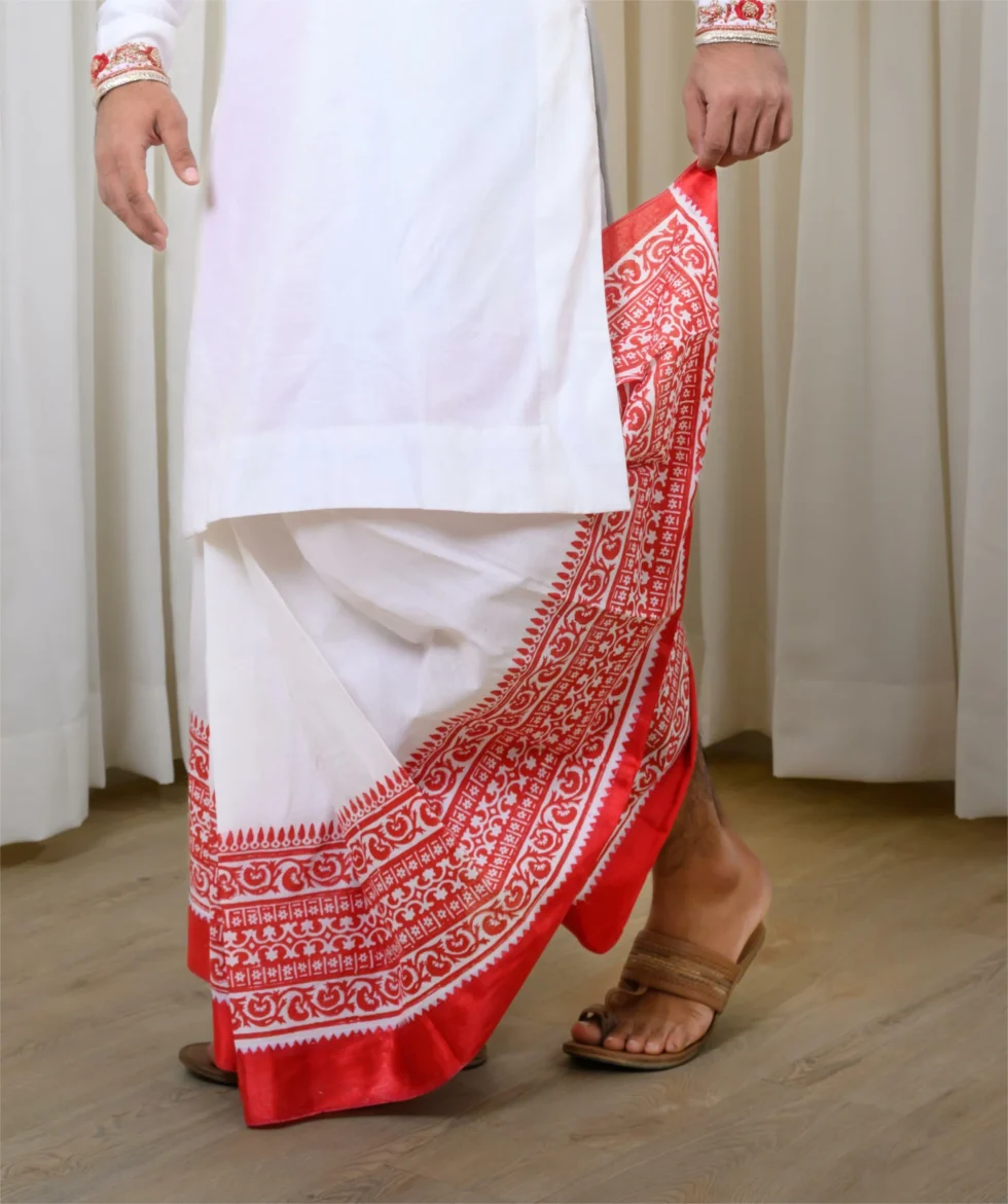Classic Red-White Hand Embroidered Kurta Paired With White Non-Stitched Dhoti With Red Wide Block Printed Border