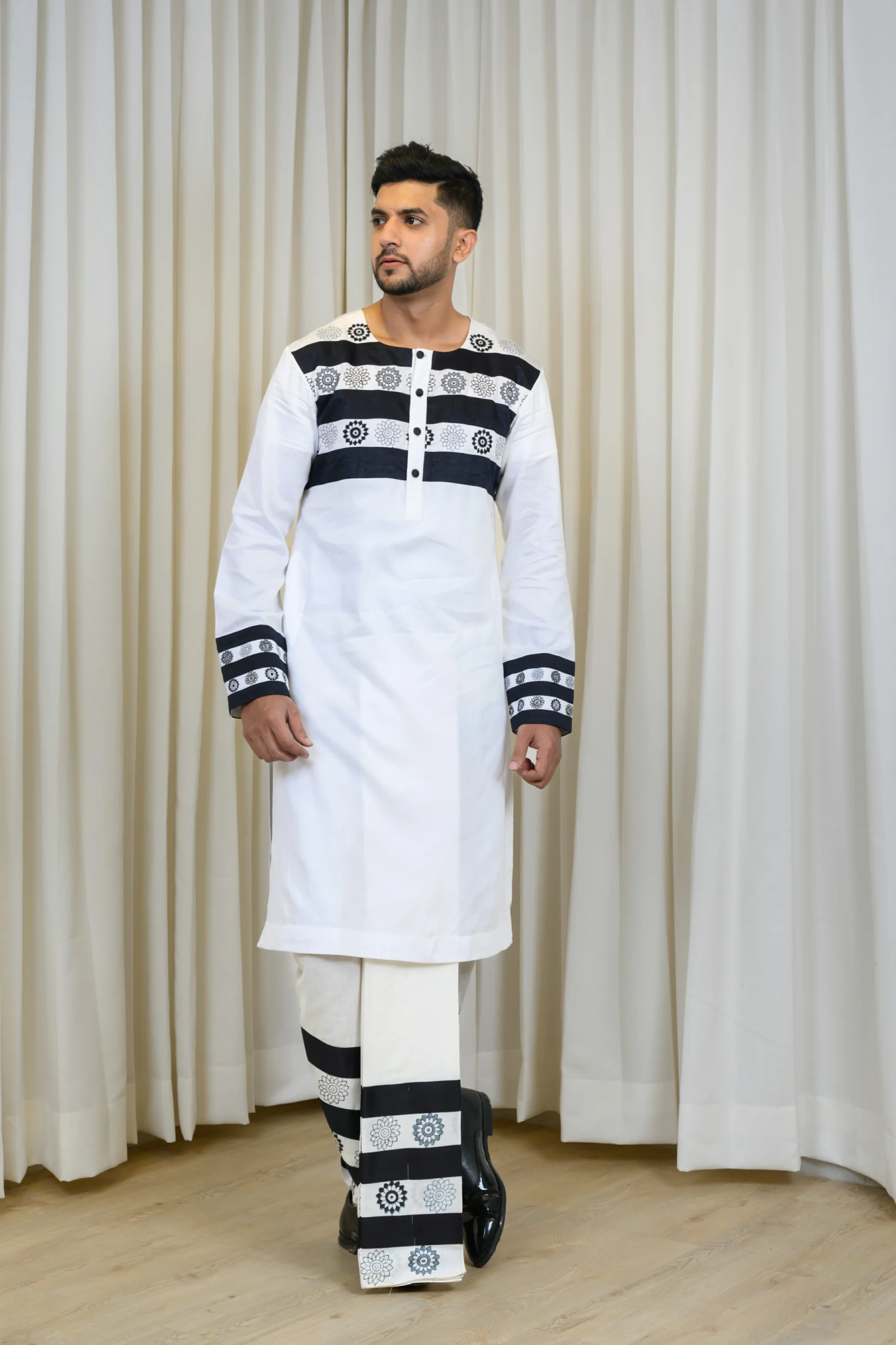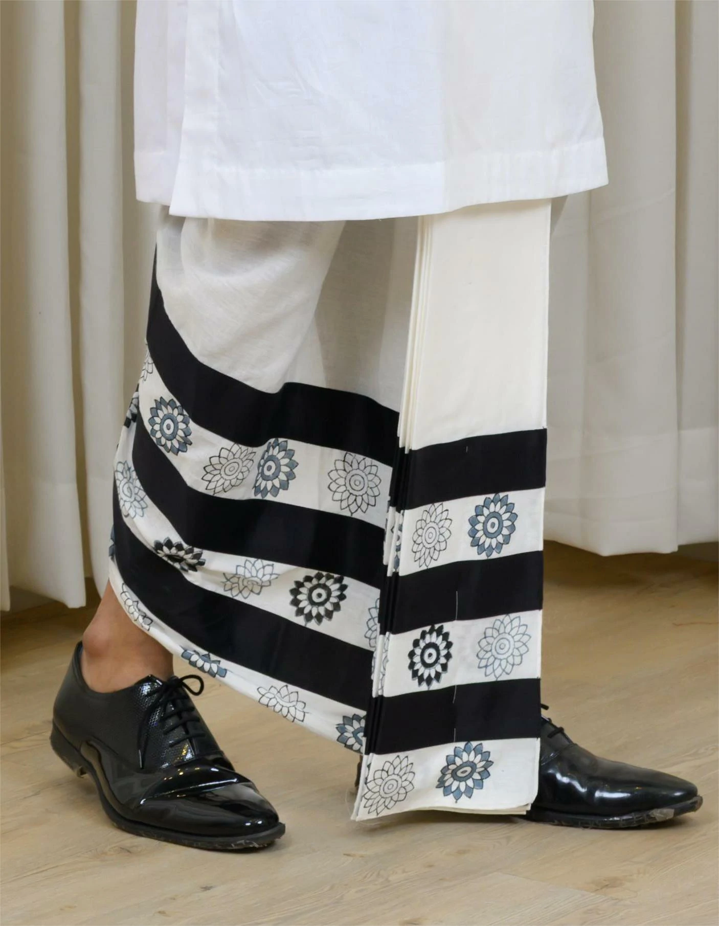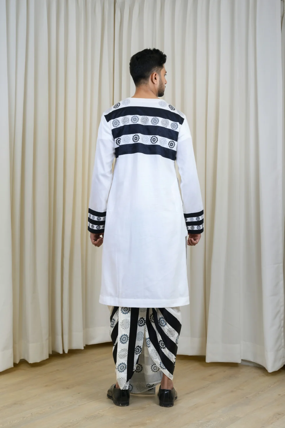 White And Black Kurta With Hand Embroidered Motifs Paired With White And Black Block Printed Stitched Dhoti