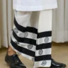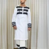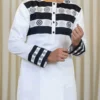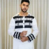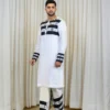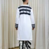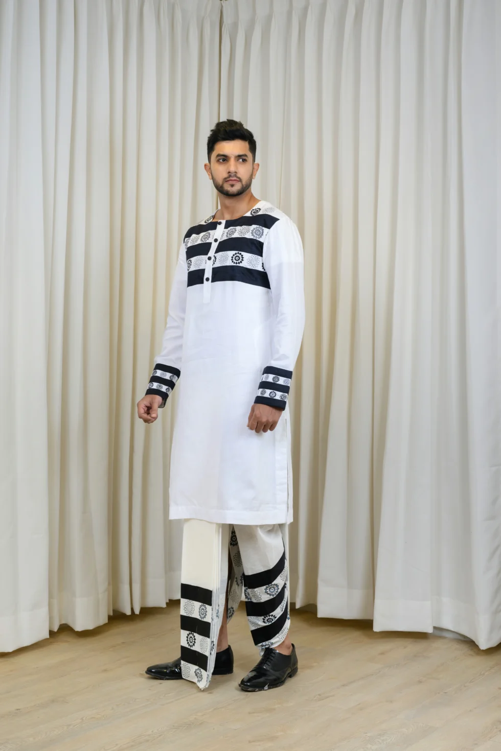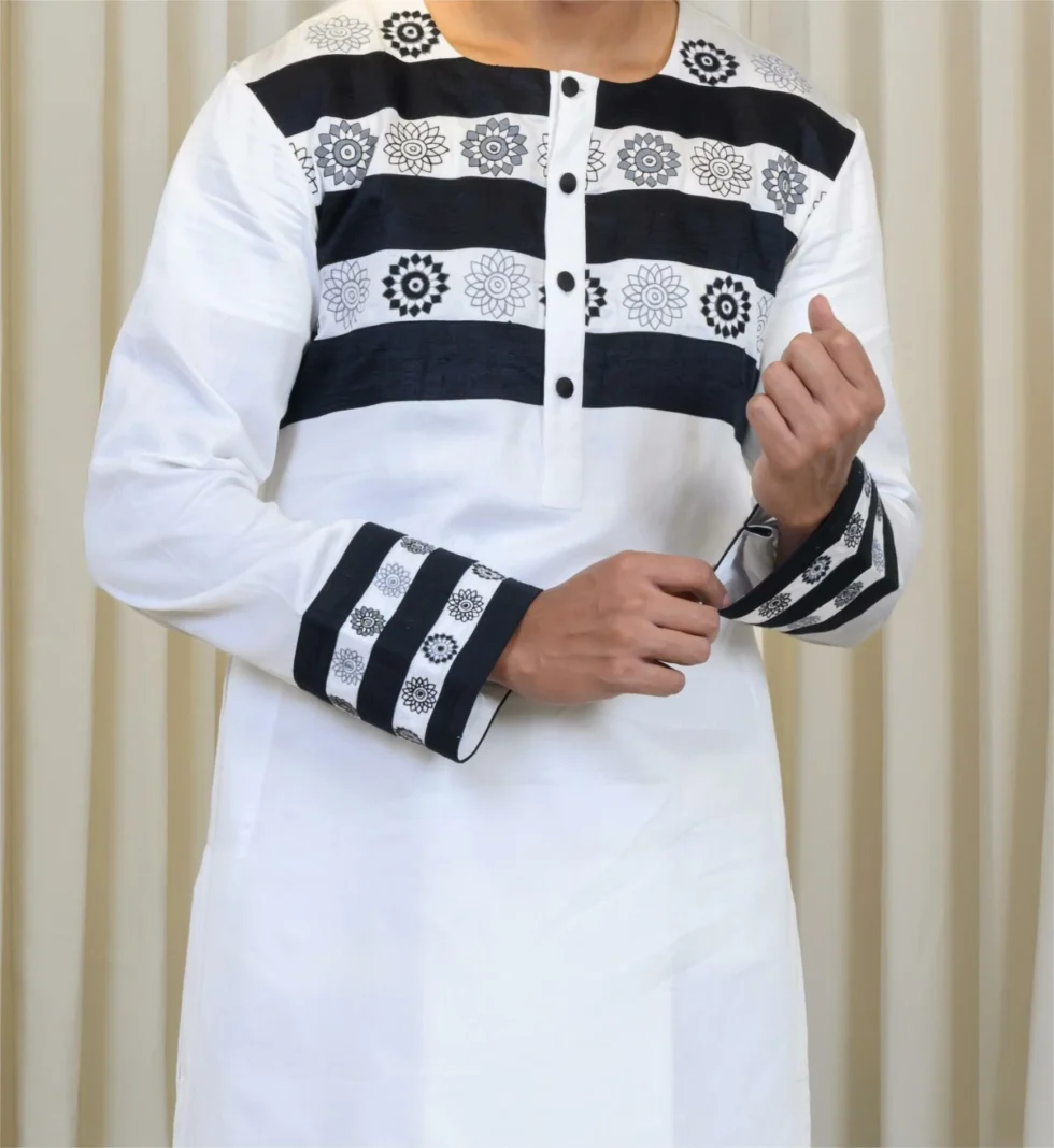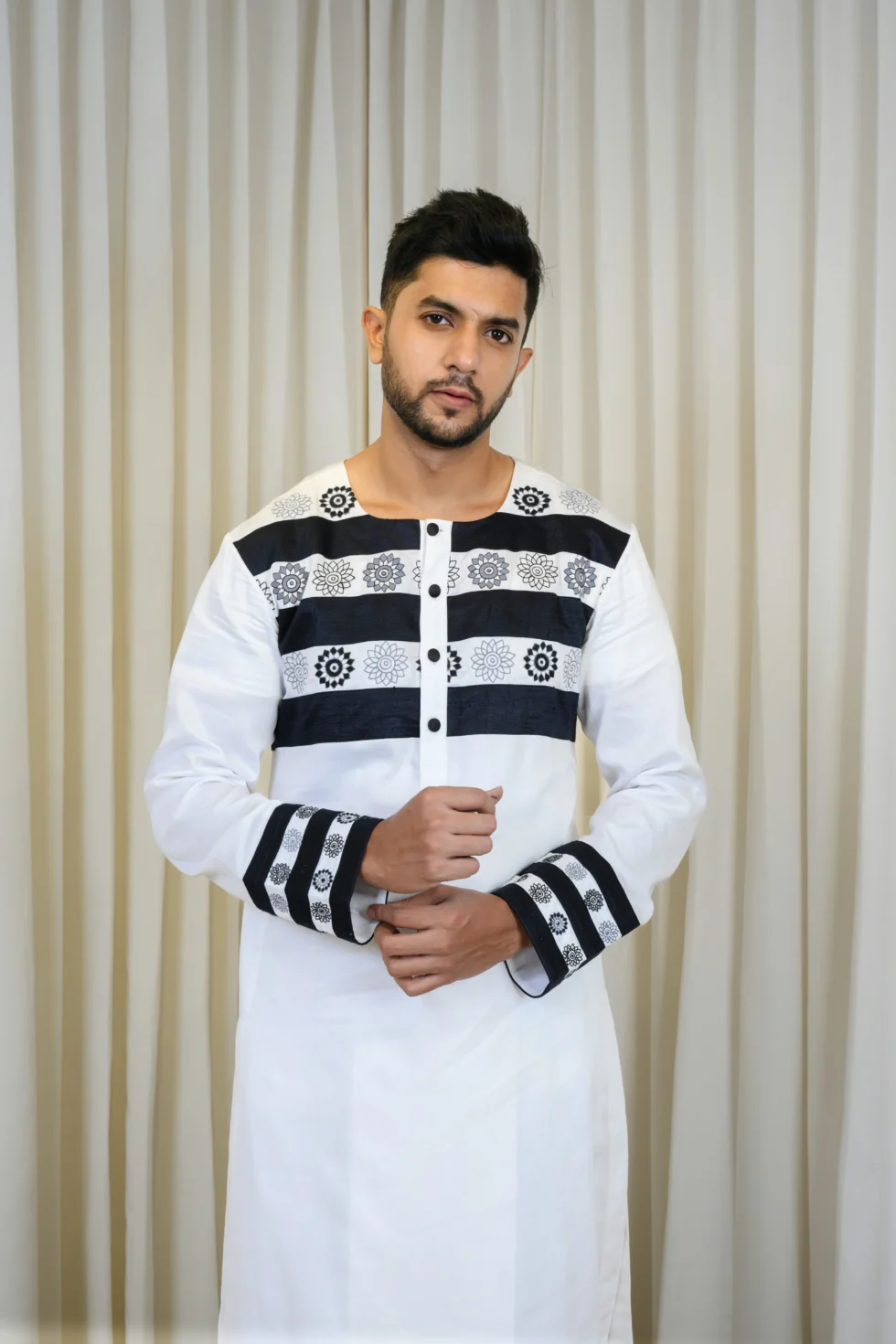 White And Black Kurta With Hand Embroidered Motifs Paired With White And Black Block Printed Stitched Dhoti