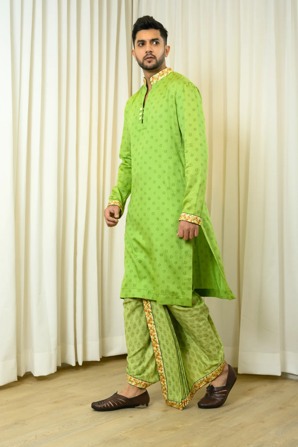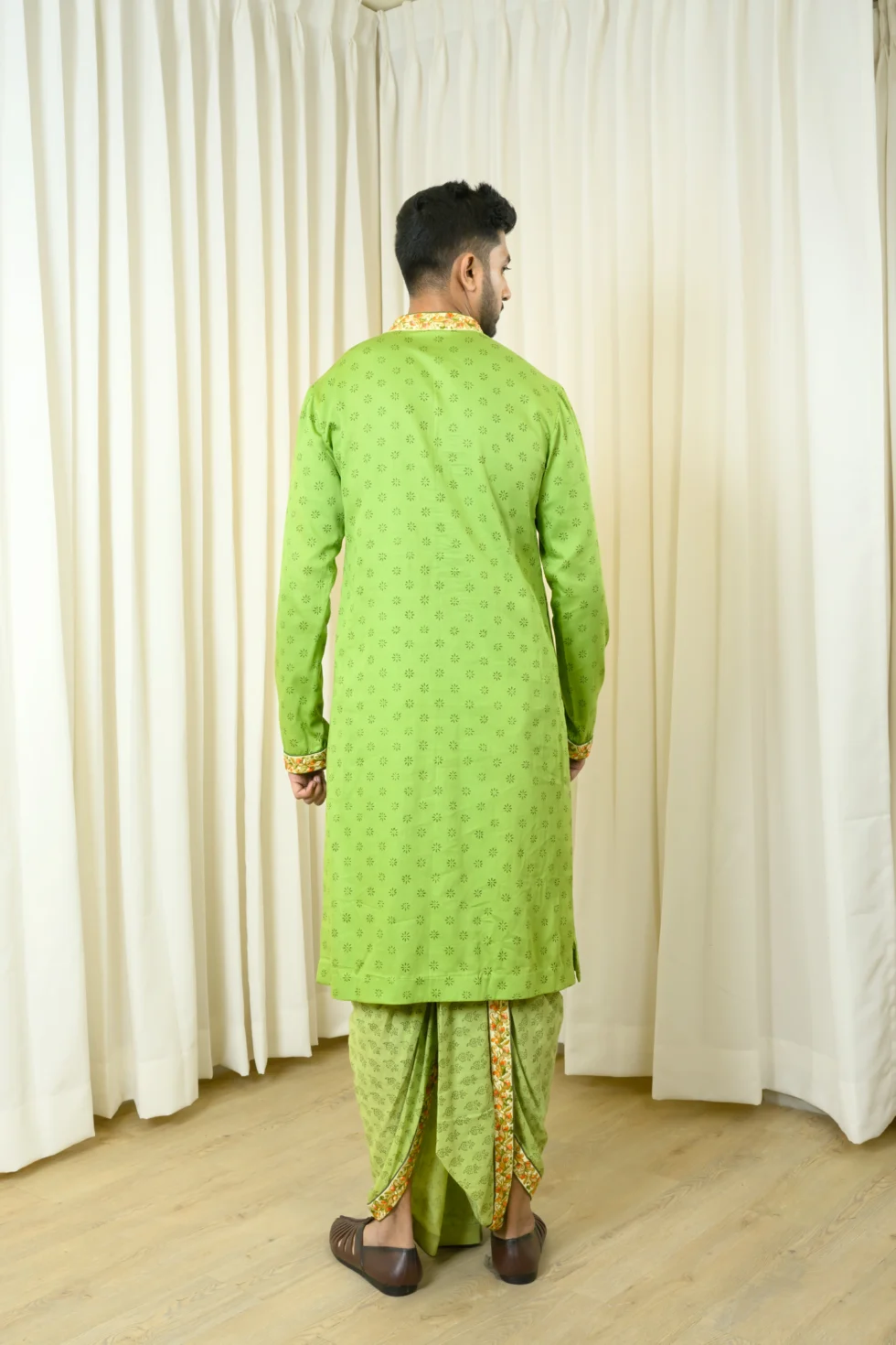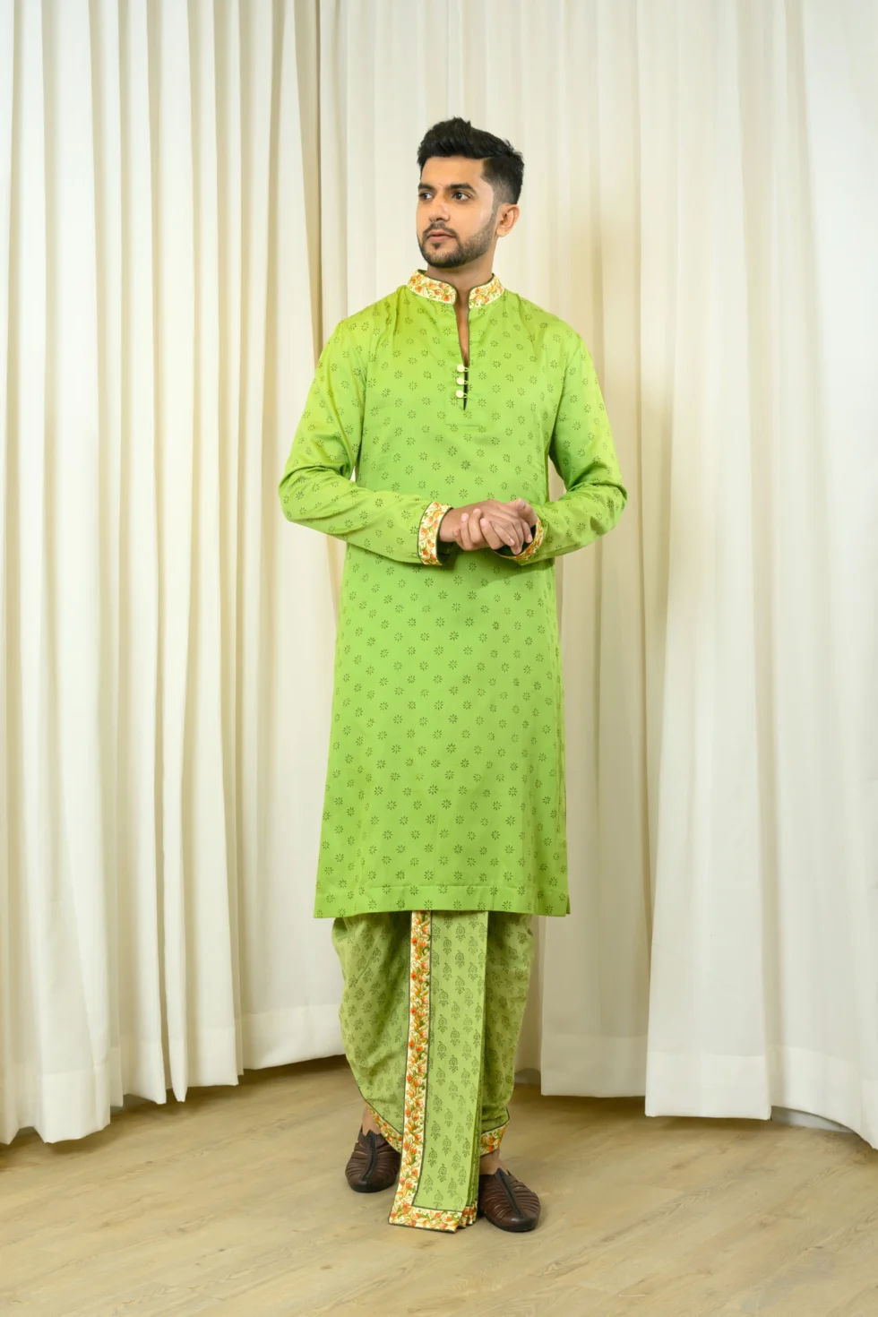 Lime Green Hand Embroidered Kurta With Block Printed Motif All Over Paired With Lime Green Block Printed Stitched Dhoti With Embroidered Border