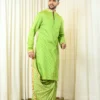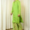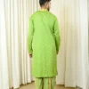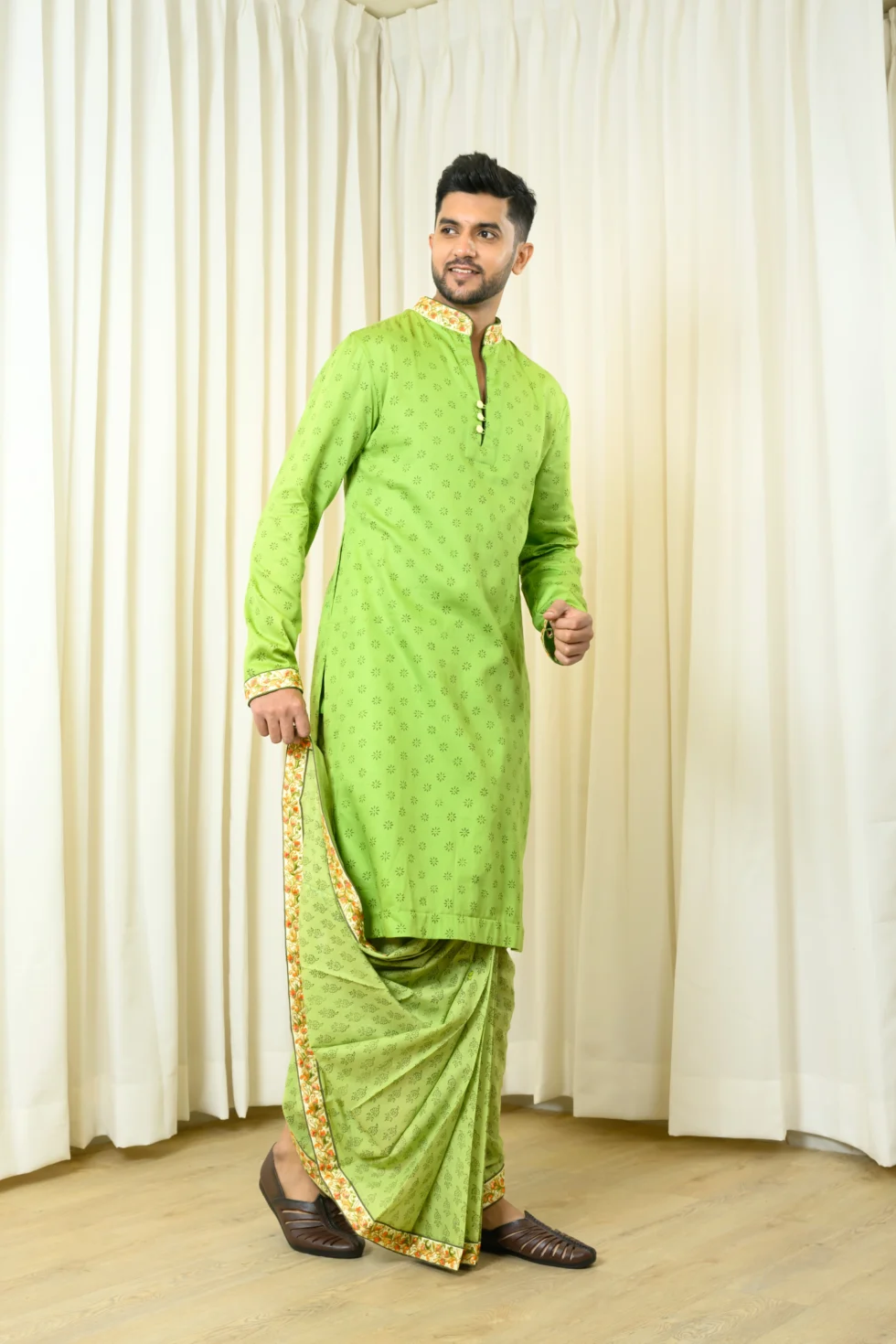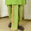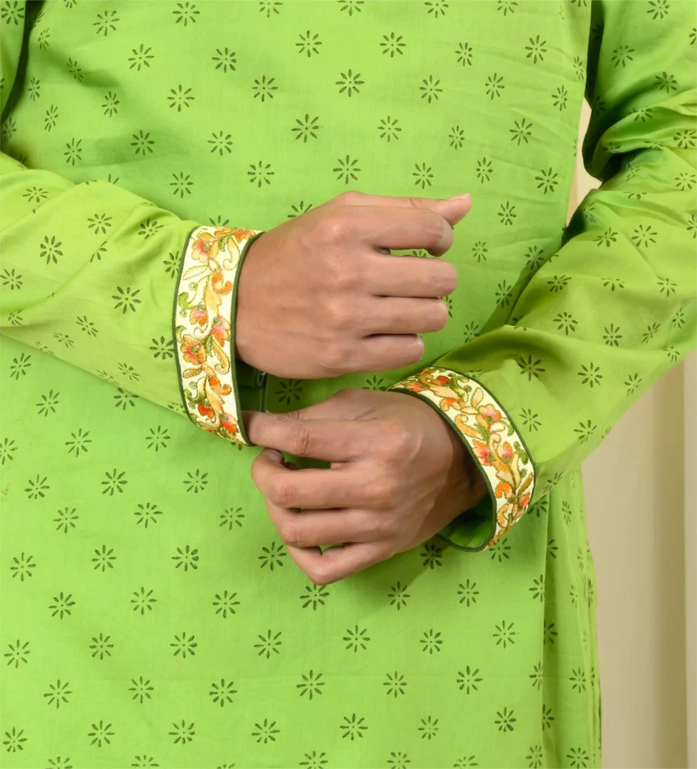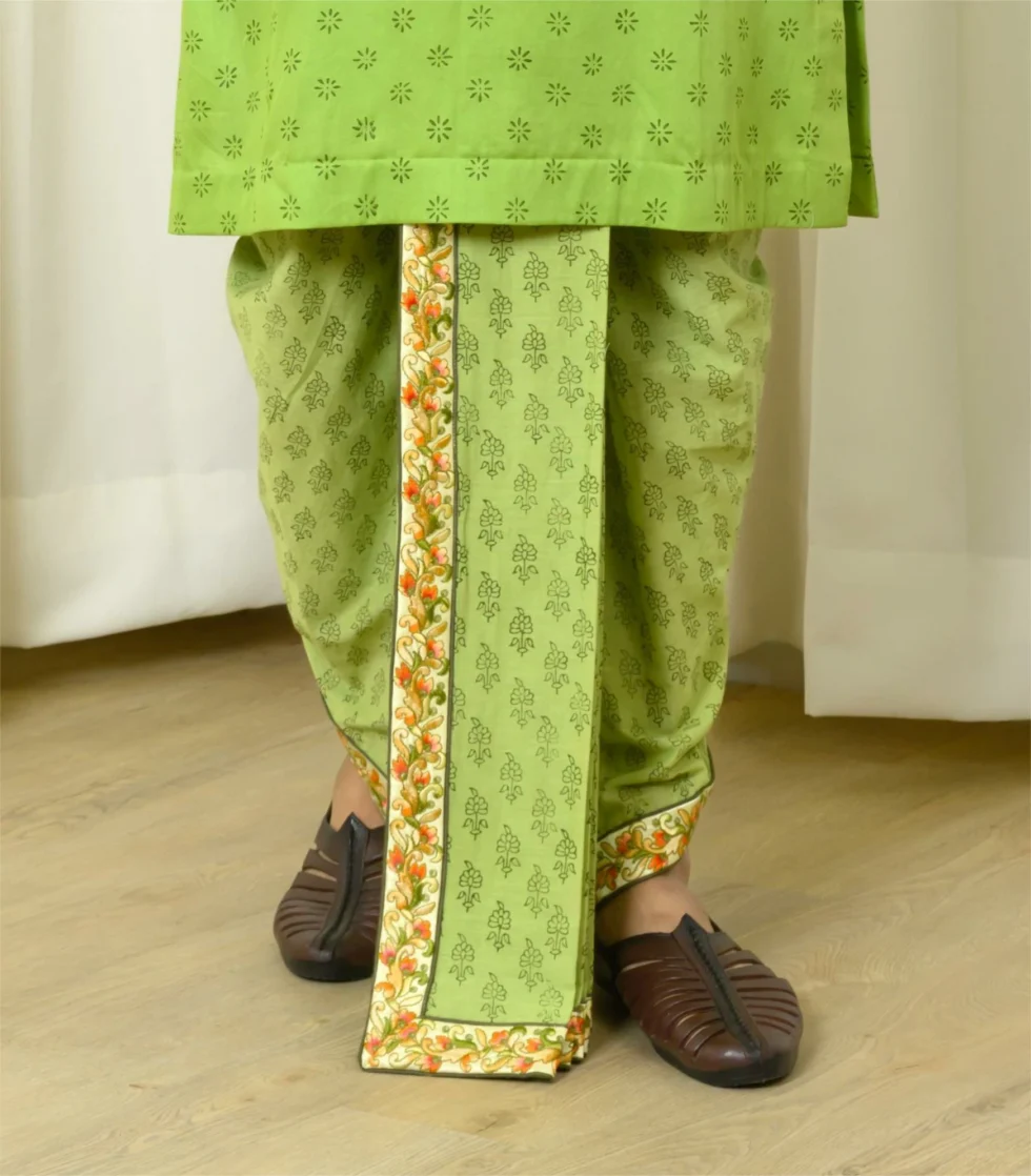 Lime Green Hand Embroidered Kurta With Block Printed Motif All Over Paired With Lime Green Block Printed Stitched Dhoti With Embroidered Border