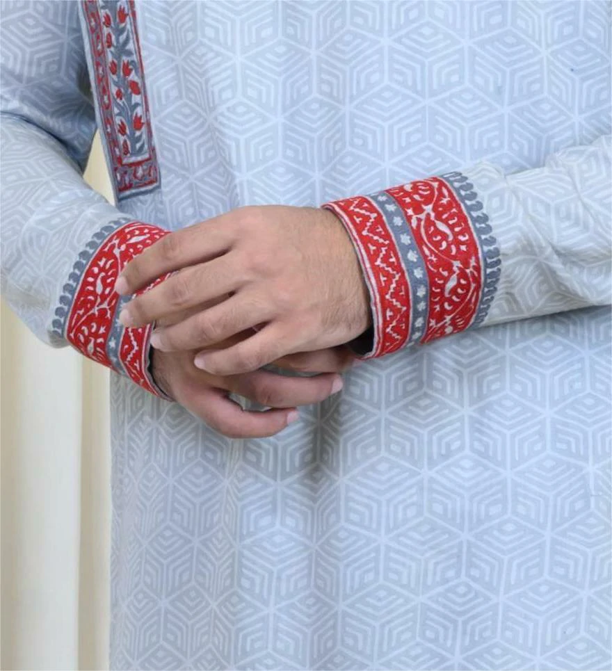 Mist Blue Kurta With Assymetrical Hand Embroidery Paired With Mist Blue Block Printed Stitched Dhoti